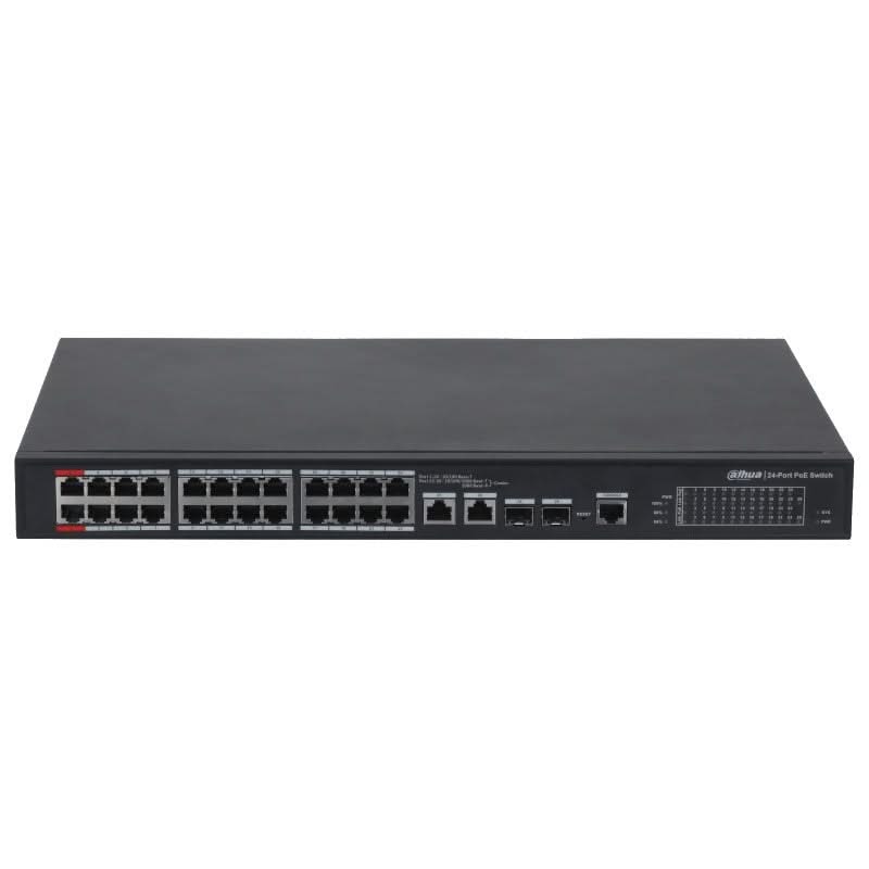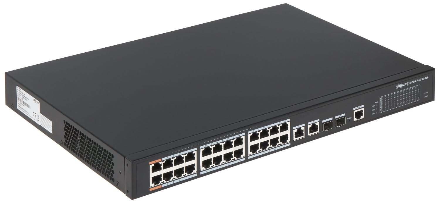 DH-PFS4226-24ET-360 è un tipo di switch PoE gestito Layer-2. Offre 24 porte PoE da 100 Mbps e 2 porte combo uplink gigabit. Il carico totale è di 240 W.