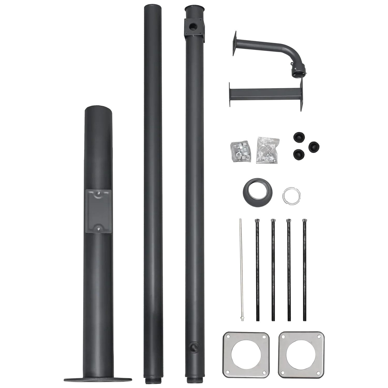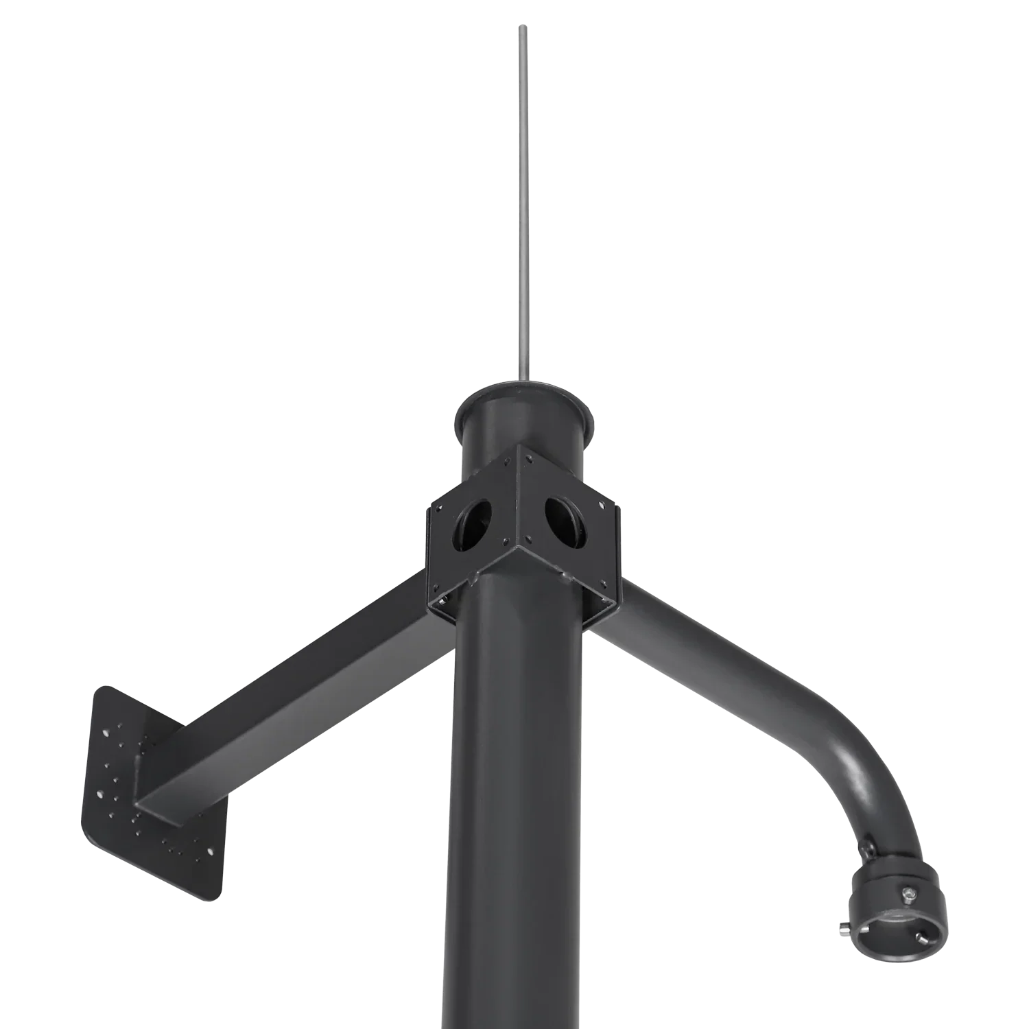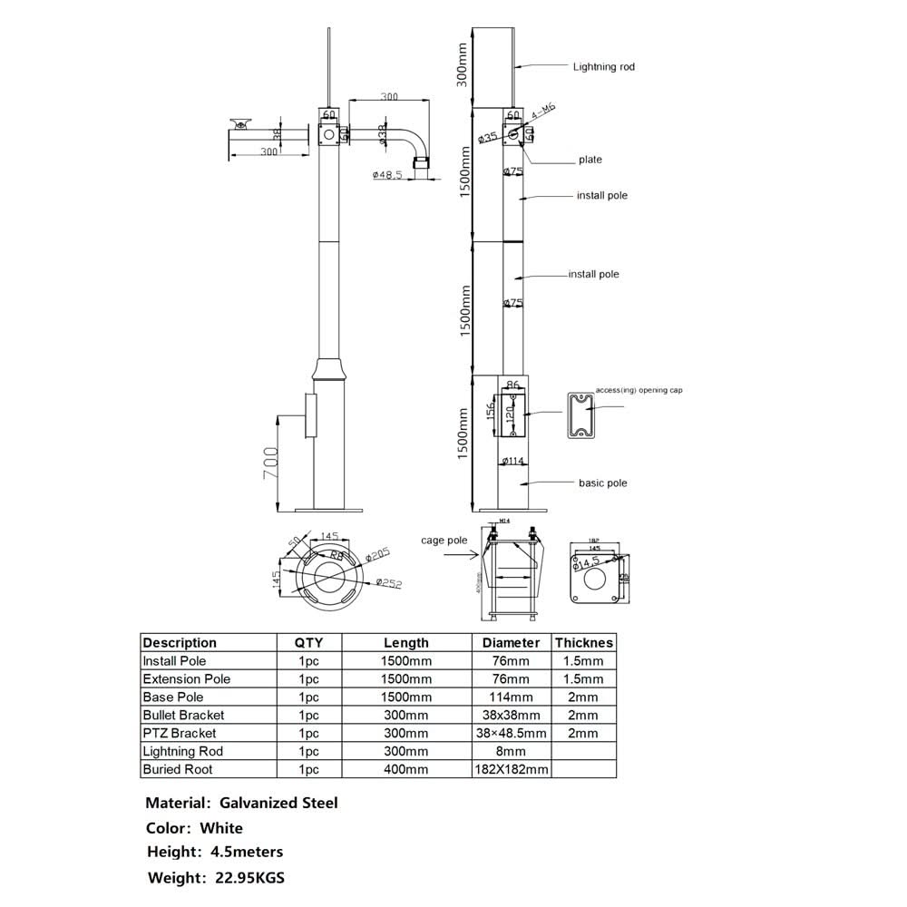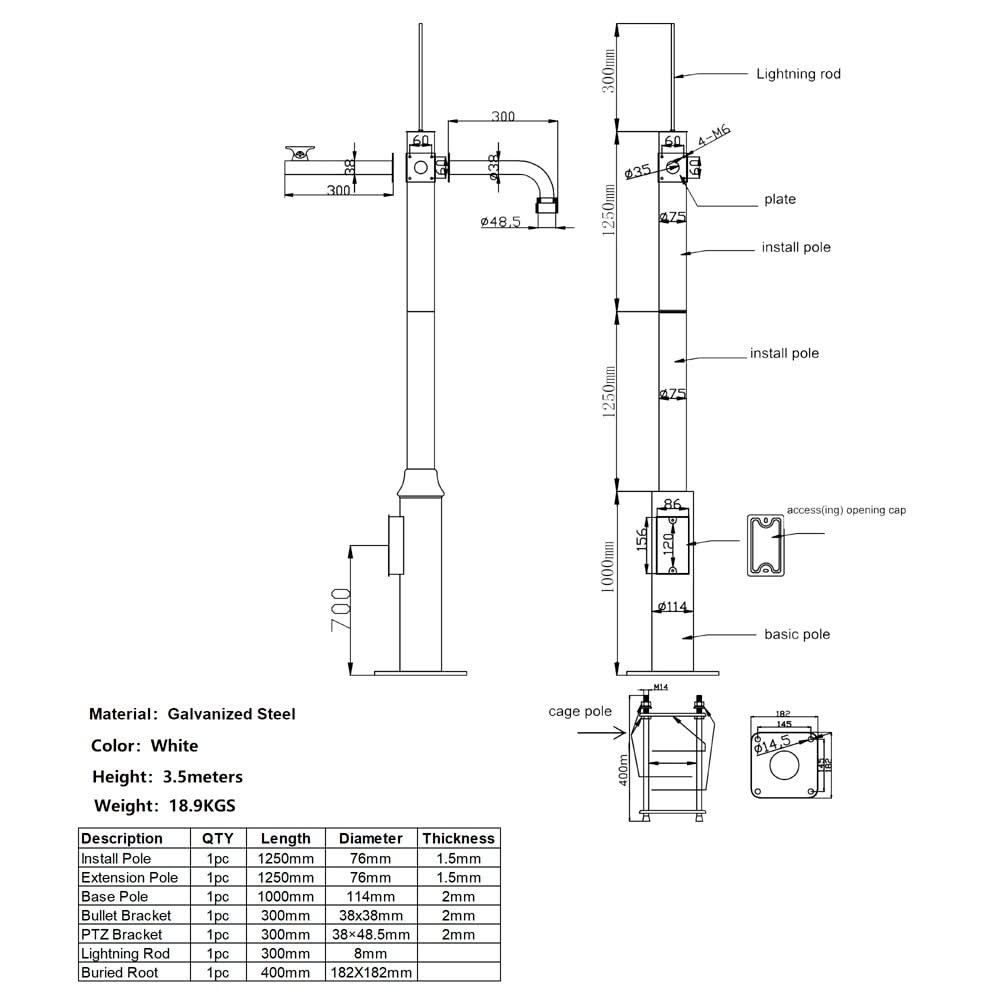 El mástil extraíble está diseñado para diversas aplicaciones profesionales y ofrece una solución robusta y duradera. El mástil tiene una altura de 3500 mm, un diámetro de 114/116 mm y un espesor de 1,8 mm, fabricado en acero galvanizado para mayor solidez y resistencia a la corrosión. El mástil pesa 31 kg y se suministra con un brazo tubular para cámara, un brazo para cámara PTZ y una placa base para enterramiento (180 x 180 mm). Además, está equipado con un pararrayos para una máxima protección contra la caída de rayos. Ideal para usar en sistemas que requieren estabilidad y protección.