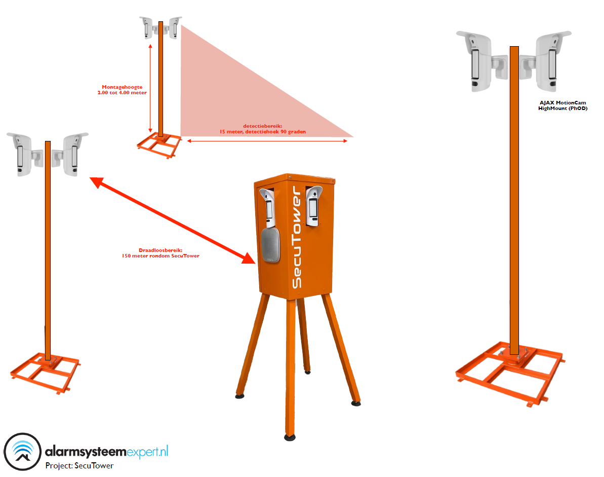 Este mástil tiene capacidad para 4 Ajax en cada dirección. Se puede montar el soporte alto MotionCam.